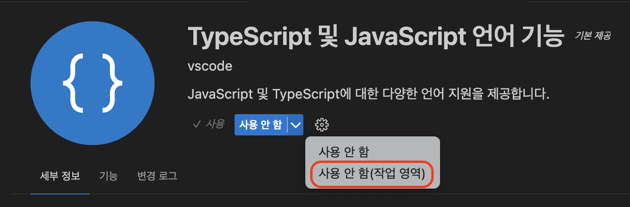 3. "TypeScript 및 JavaScript 언어 기능" 을 선택하고 "사용 안 함(작업 영역)"을 클릭한다.